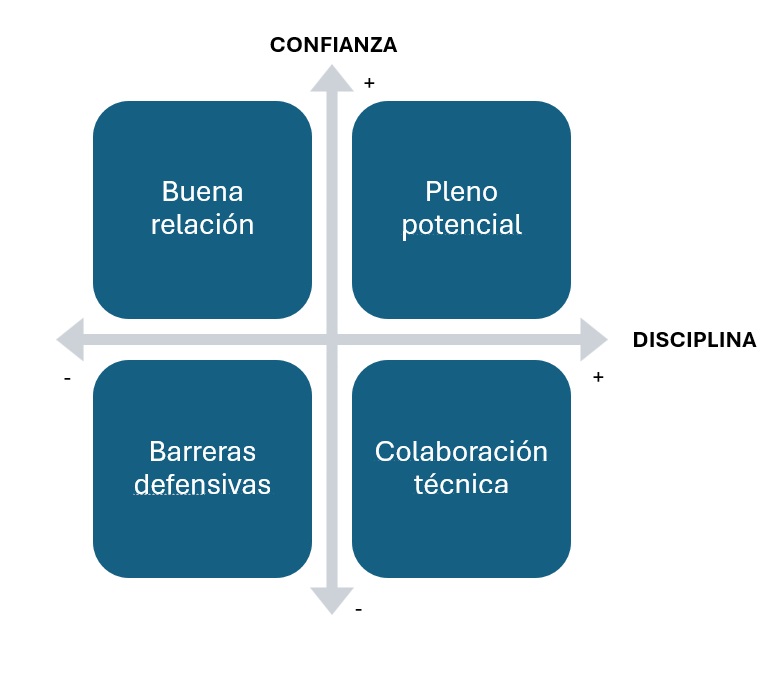 - Colaboración técnica: Si el nivel de confianza sigue siendo bajo, pero aumenta la disciplina en el proceso, la cooperación es meramente técnica. Esto es propio de multinacionales, y funciona relativamente bien cuando estás en entornos estables. Es un escenario muy ineficiente parea Innovar y desplegar el talento.